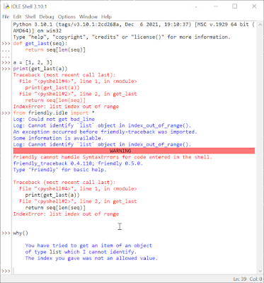 Let's now have a look at IDLE. Recently, IDLE has added support for custom exception hook. Instead of requiring the use of its own console when using IDLE, friendly can make use of this new capability of IDLE to provide help with run time errors - but not SyntaxErrors as those are handled in a peculiar way by IDLE.