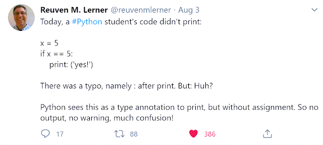 A third dialect would be a "beginner" dialect. The goal of the beginner dialect would be to make it easier to learn basic programming concepts as opposed to learning a quirky syntax to express these concepts. This beginner dialect would be, in version 4.0, a strict subset of the main dialect. It would not include type annotations, and it might perhaps also exclude the new pattern matching syntax and other syntactic constructs. For example, using the keyword is might only be limited to checking if the object is one of the three singletons (None, True, False); other uses of is could and should be done with "== id(thing)". Based on feedback from educators, it might perhaps make sense to eventually introduce a few additional keywords and constructs not available from the main dialect, such as: